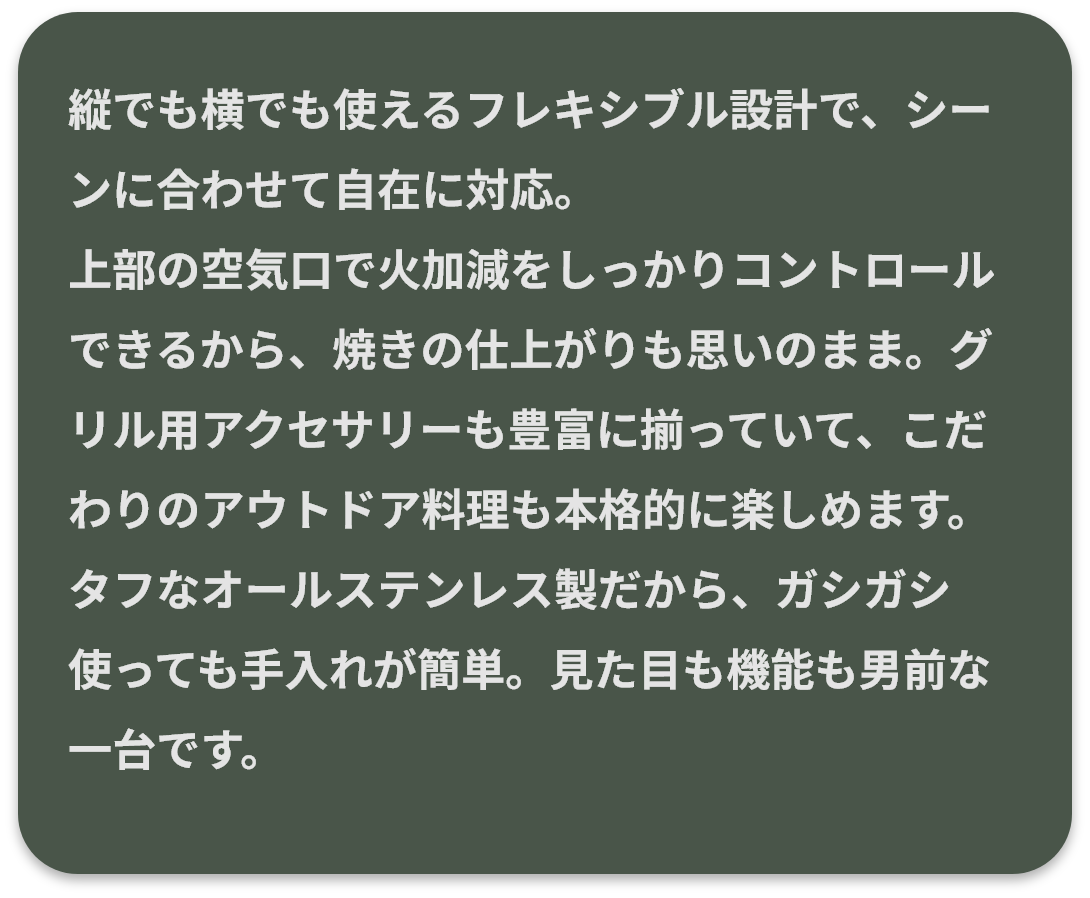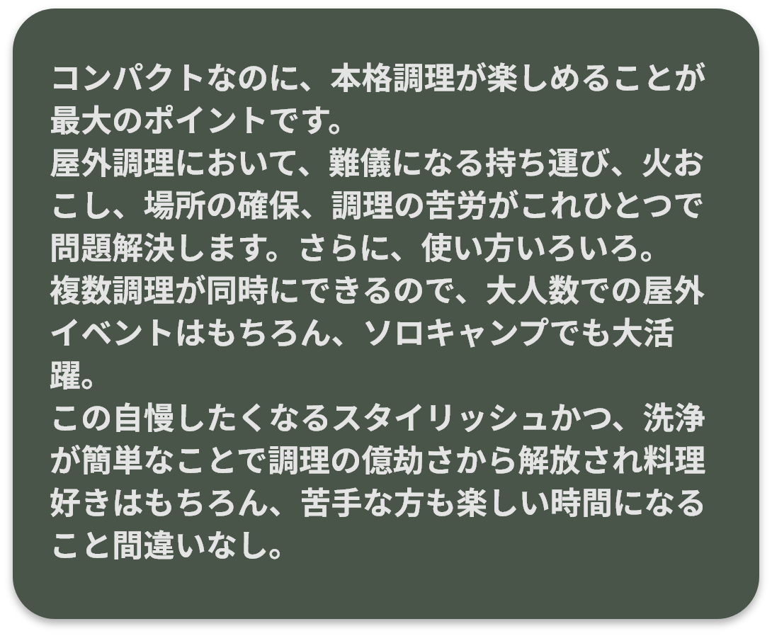 このまま普通のBBQコンロを使い続けたら、10年後も同じような焼肉とソーセージを繰り返すだけ。